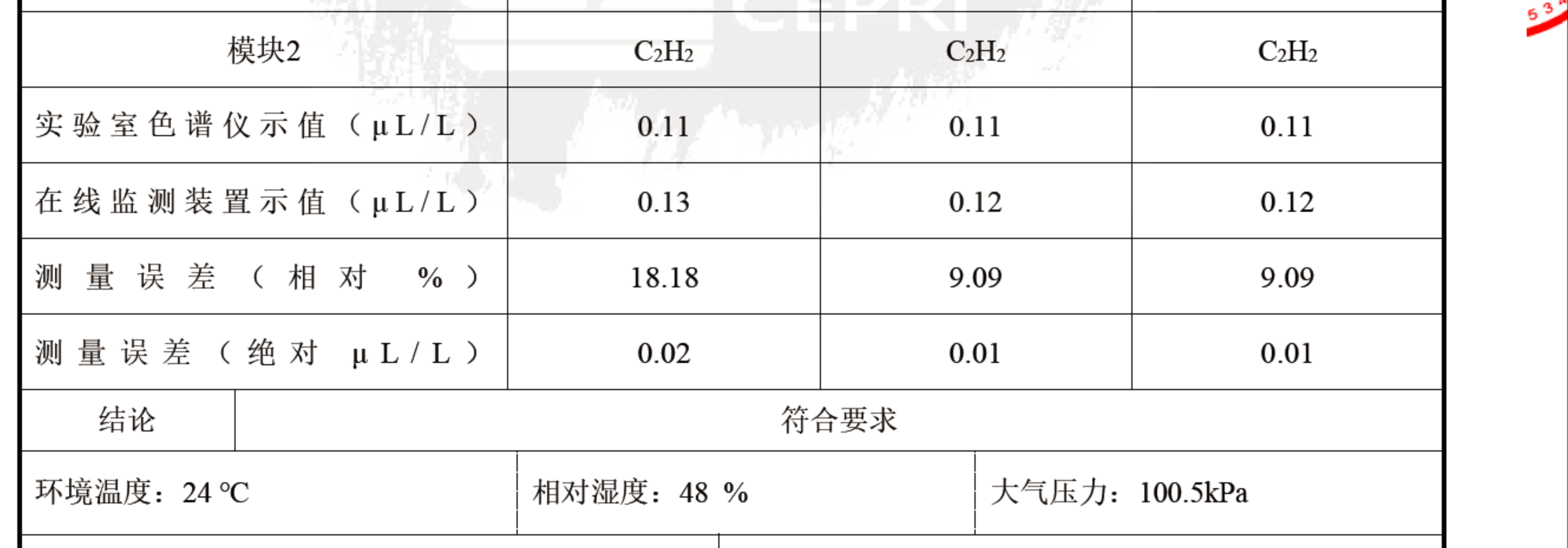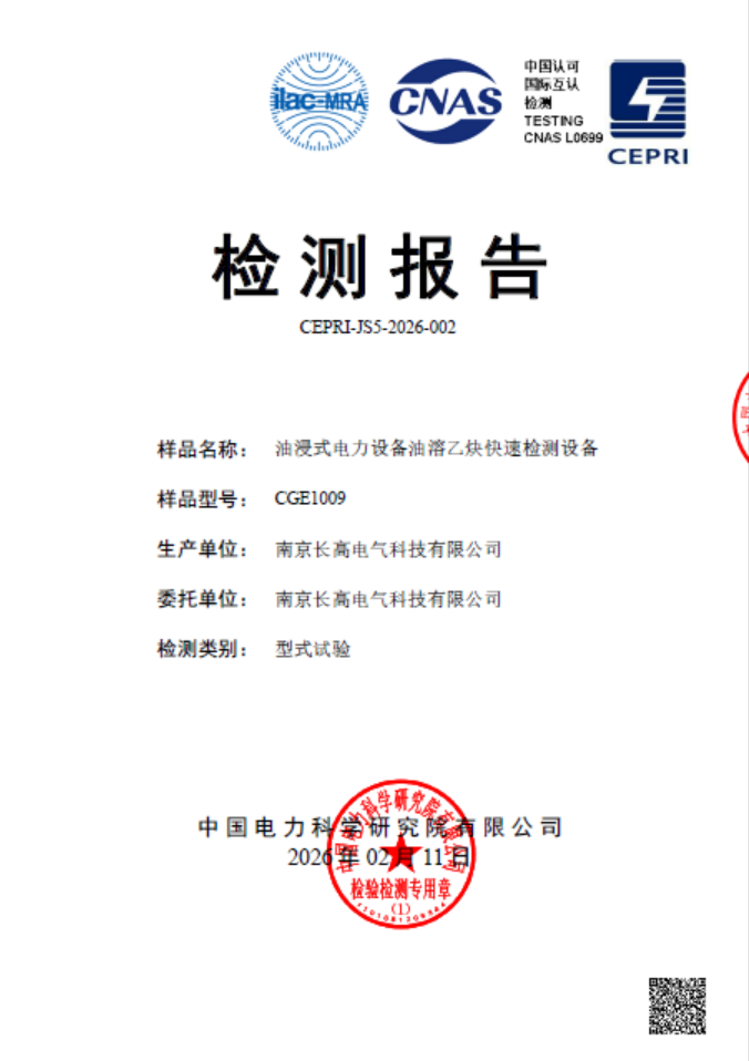 公司研发的光声光谱原理的CGE1009油浸电力设备油溶乙炔快速检测设备顺利拿到中国电科院型式检测报告,对乙炔最小检测限低于0.1uL/L,对0.11 uL/L离线浓度油样能稳定、精准检测出。